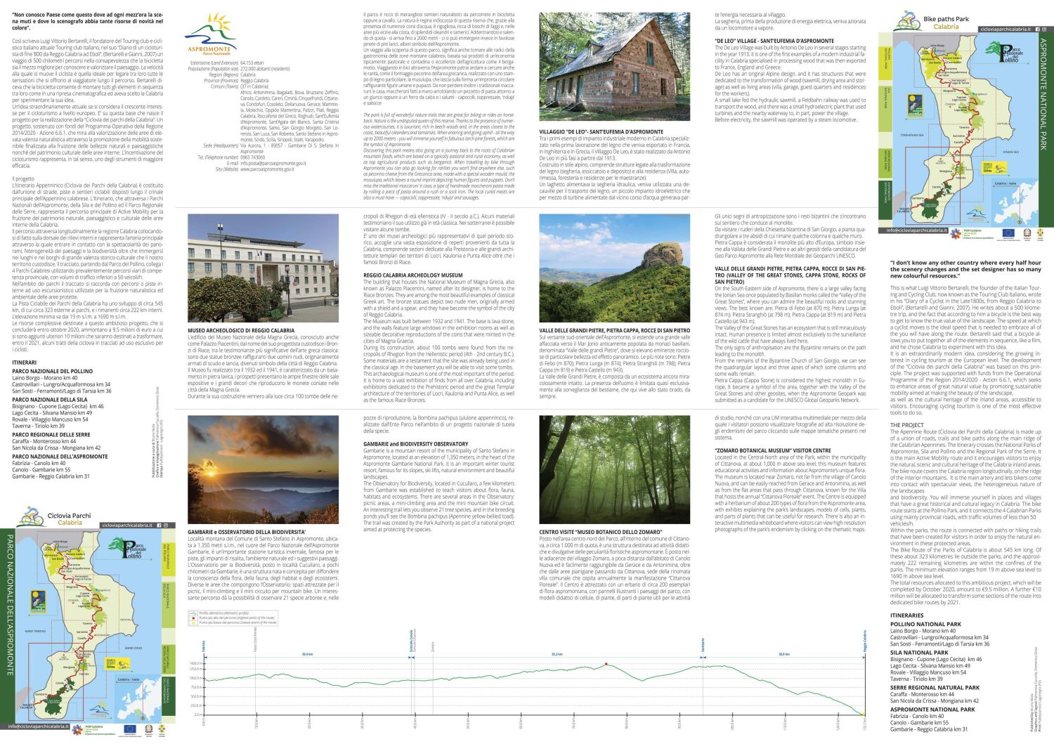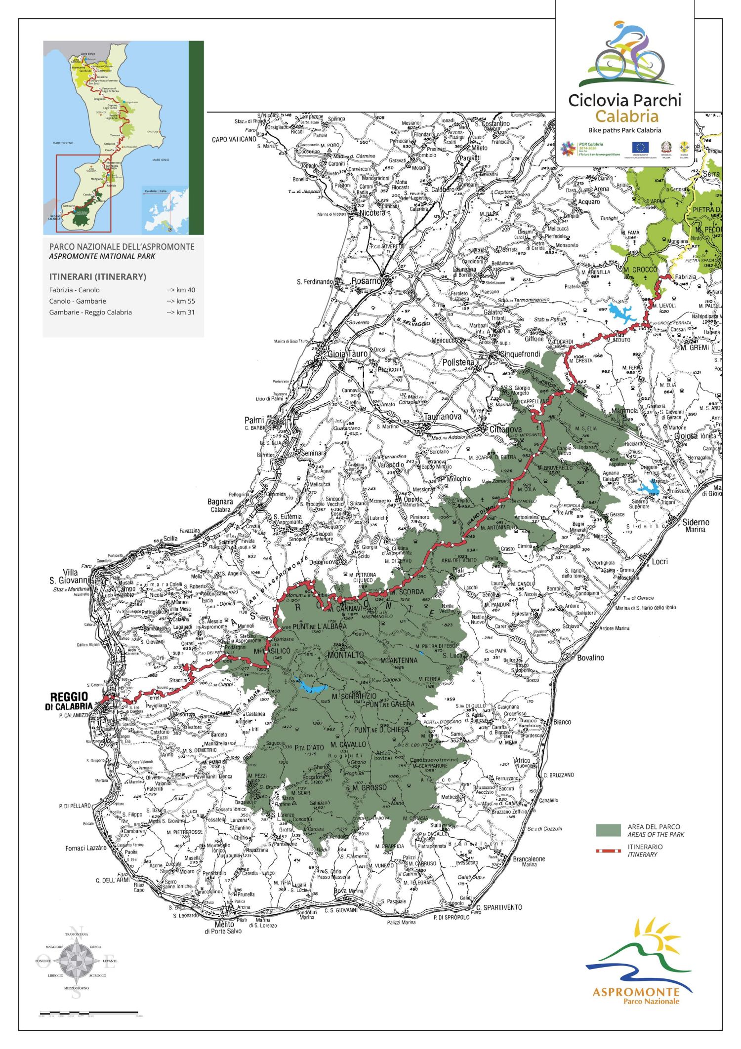 L’itinerario Appenninico (Ciclovia dei Parchi della Calabria) è costituito dall’unione di strade, piste e sentieri ciclabili disposti lungo il crinale principale dell’Appennino calabrese. L’Itinerario, che attra - versa i Parchi Nazionali dell’Aspromonte, della Sila e del Pollino ed il Parco Regionale delle Serre, rappresenta il percorso principale di Active Mobility per la fruizione del patrimonio naturale, pae - saggistico e culturale delle aree interne della Calabria. Il percorso attraversa longitudinalmente la regione Calabria collocandosi di fatto sulla dorsale dei rilievi interni e rappresenta l’arteria principale attraverso la quale entrare in contatto con la spetta - colarità dei panorami, l’eterogeneità dei paesaggi e la biodiversità oltre che immergersi nei luoghi e nei borghi di grande valenza storico-culturale che il nostro territorio custodisce. Il tracciato, partendo dal Parco del Pollino, collega i 4 Parchi Ca - labresi utilizzando prevalentemente percorsi viari di competenza provinciale, con volumi di traffico inferiori a 50 veicoli/h. Nell’ambito dei parchi il tracciato si raccorda con percorsi o piste interne ad uso escursionistico utilizzate per la fruizione naturalistica ed ambientale delle aree protette. La Pista Ciclabile dei Parchi della Calabria ha uno sviluppo di circa 545 km, di cui circa 323 esterne ai parchi, e i rimanenti circa 222 km interni. L’elevazione minima va dai 19 m s.l.m. a 1690 m s.l.m. Le risorse complessive destinate a questo ambizioso progetto, che si concluderà entro ottobre 2020, ammontano a 9.5 milioni di euro a cui si sono aggiunti ulteriori 10 milioni che saranno desti - nati a trasformare, entro il 2021, alcuni tratti della ciclovia in tracciati ad uso esclusivo per i ciclisti.